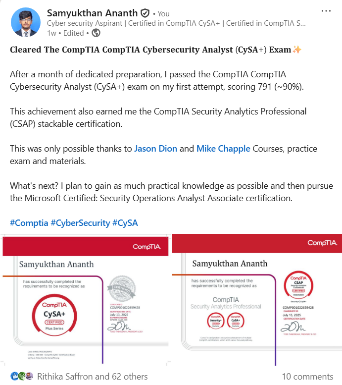 Shared a reel on tips to clear the Security+ exam efficiently.